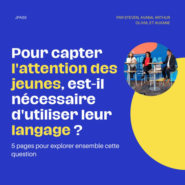 Certains des groupes ont assisté à la table ronde "Faut-il parler jeune pour toucher les jeunes", animée par Carole Bélingard, rédactrice en chef chez France Télévisions, Nacer Boubekeur, journaliste chez France Télévisions, et Léo Tescher, présentateur d'un podcast pour France Info. Ils ont choisi de retranscrire cet échange via un mini-reportage, un articles ou un carrousel, réalisés d'une main de maître, et nourris par des témoignages captivants récoltés sur le vif qu'on vous laisse découvrir.